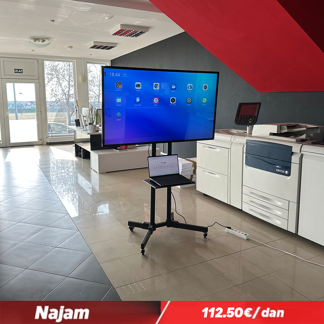 Najam mobilnog stalka s nosačem za PC ili laptop + Display 43″/55″/65″ se dogovara uz ugovor o najmu od najmanje 1 dan.